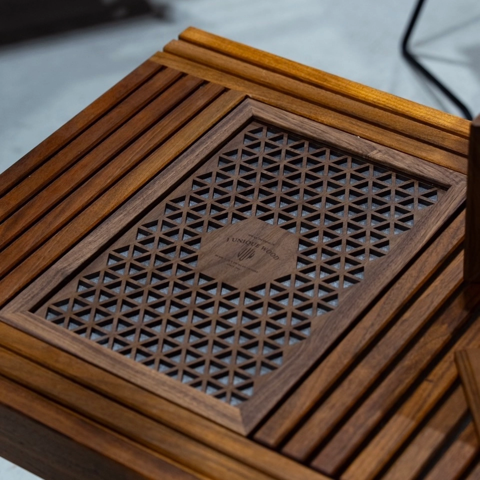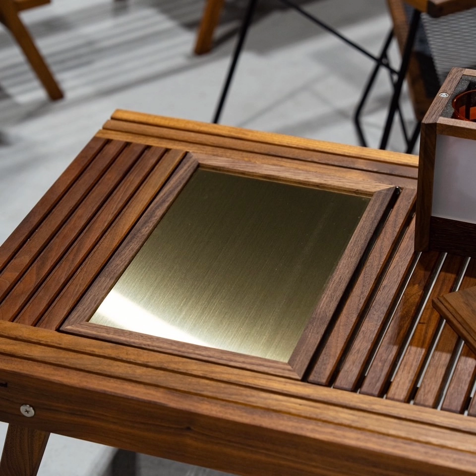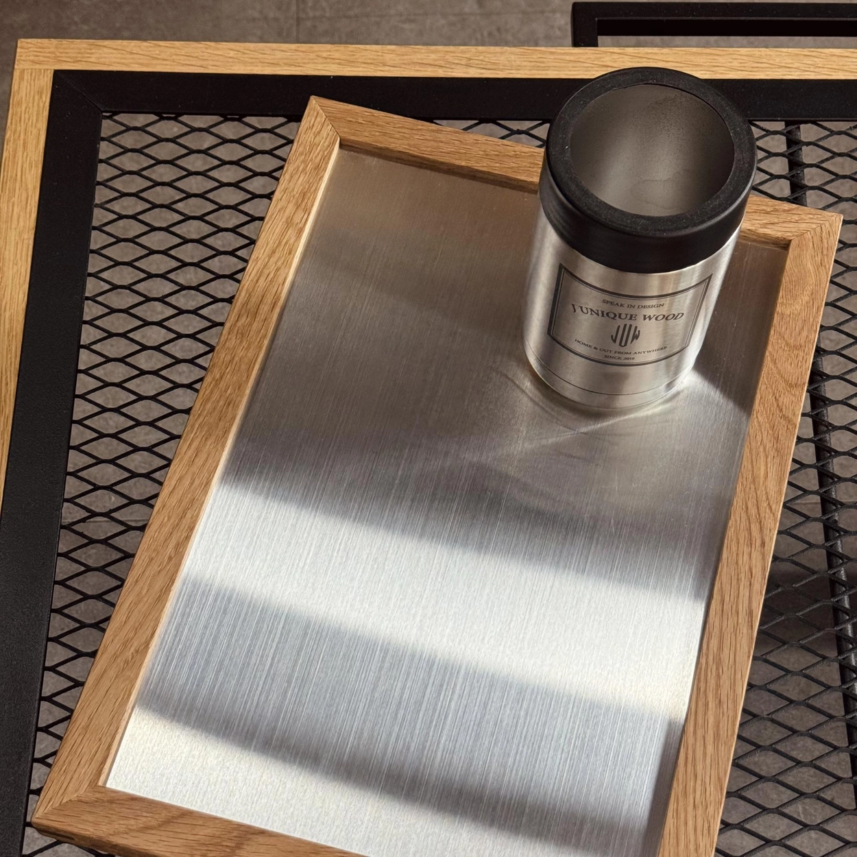 中のウッドの柄を活かし、ウッドの間に見えるステンレス部分は艶消し加工をしマットな感じを表現しました。